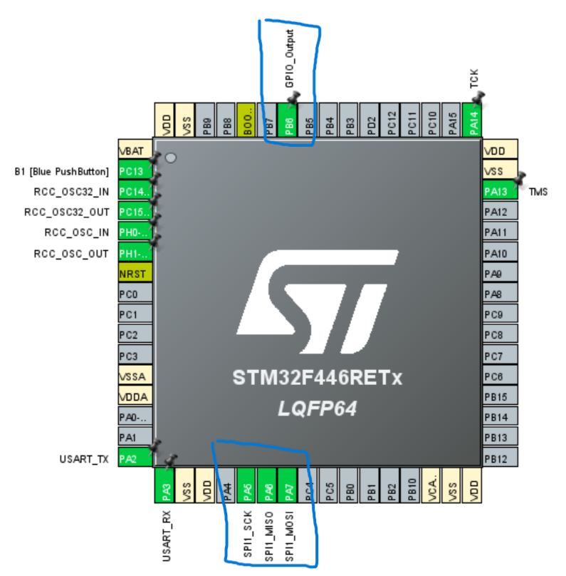 今回はSPI1を使うので図のようにSPIのピンを3つとGPIOを設定しよう