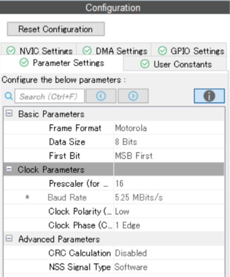 SPI1の設定を開き、BaudRateが1~5Mbits程度になるようにPrescalerの値を変更しよう