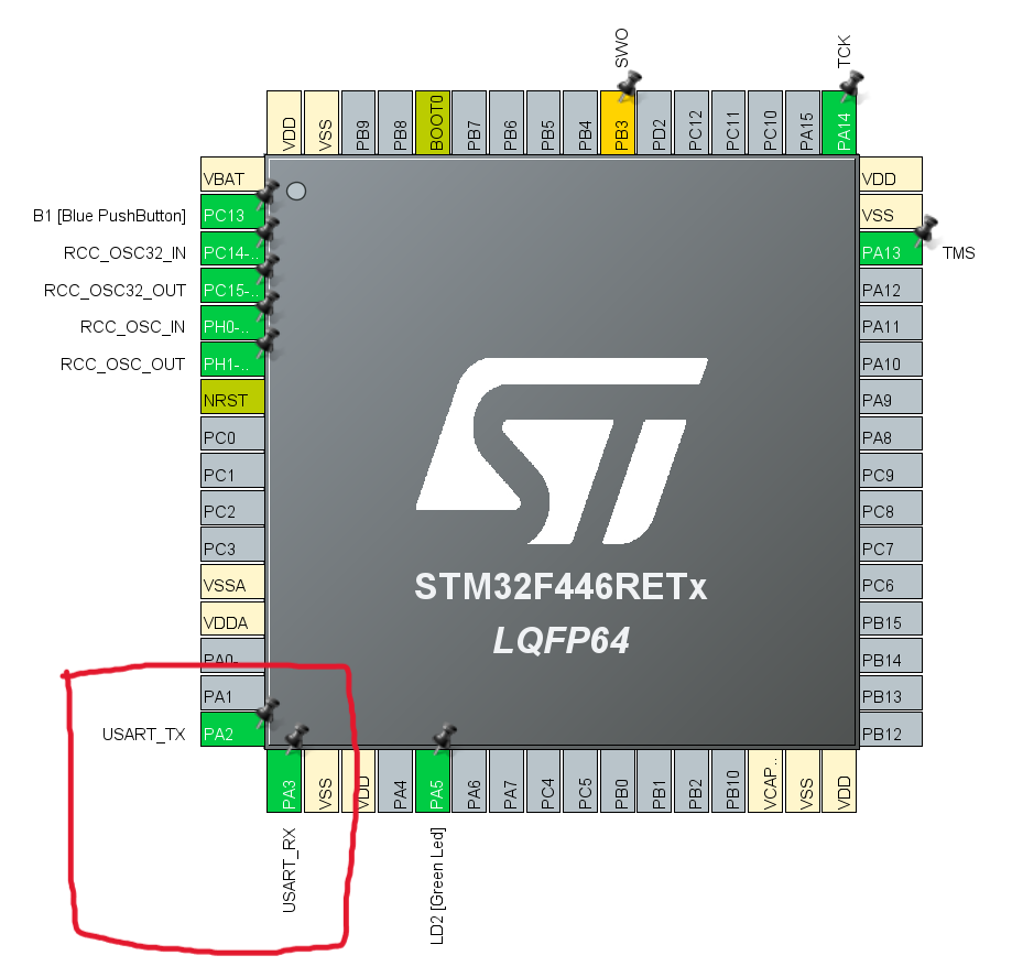 画像のようにPA2とPA3にUSART_RX(受信)とUSART_TX(送信)を割り当ててみよう