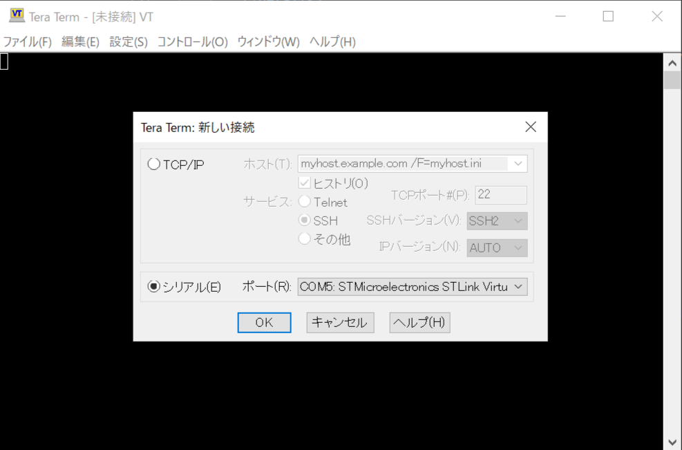- TeraTermを起動して、新しい接続を開く(ファイル > 新しい接続で開けるよ)
