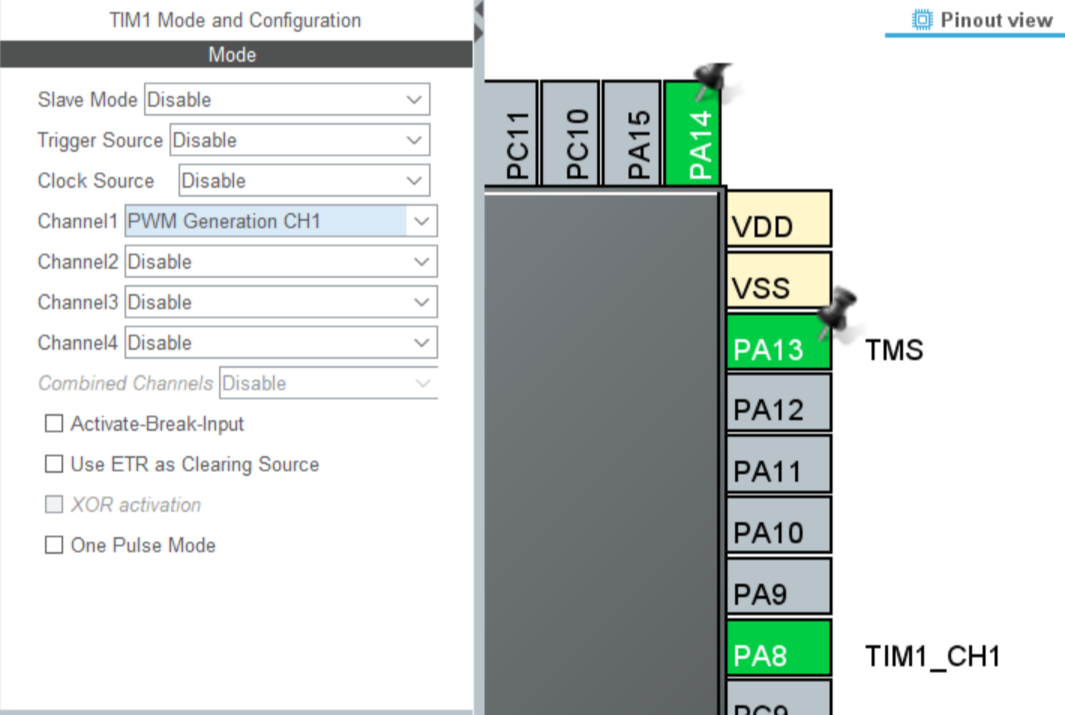 (プロジェクト名).iocからPA8を選択し、TIM1_CH1を割り当てよう