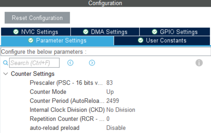 この設定をすることで、STM32のクロックをサーボモーターに送りたい周期に変換している