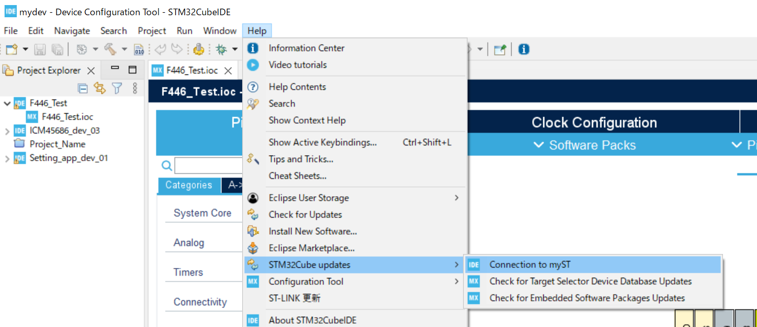 上のメニューのHelp > STM32Cube updates > connectionMySTを選択しログインしよう