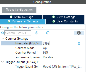 そこでPreScalerを8399、Counter Periodを9999にする(0からカウントがスタートするので1引く)