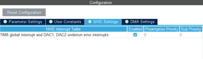 今回はDMAを使わない割り込みなので、NVICからTIM6のGlobal Interruptsを有効化しておこう